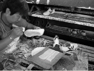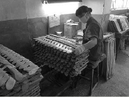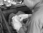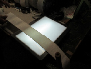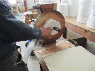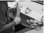 アッパーと底との間に加硫剤(硫黄など)を加えた柔らかいゴムを巻き、専用釜に入れ高温で圧力をかけながら化学変化により強力に接着させる製法です。